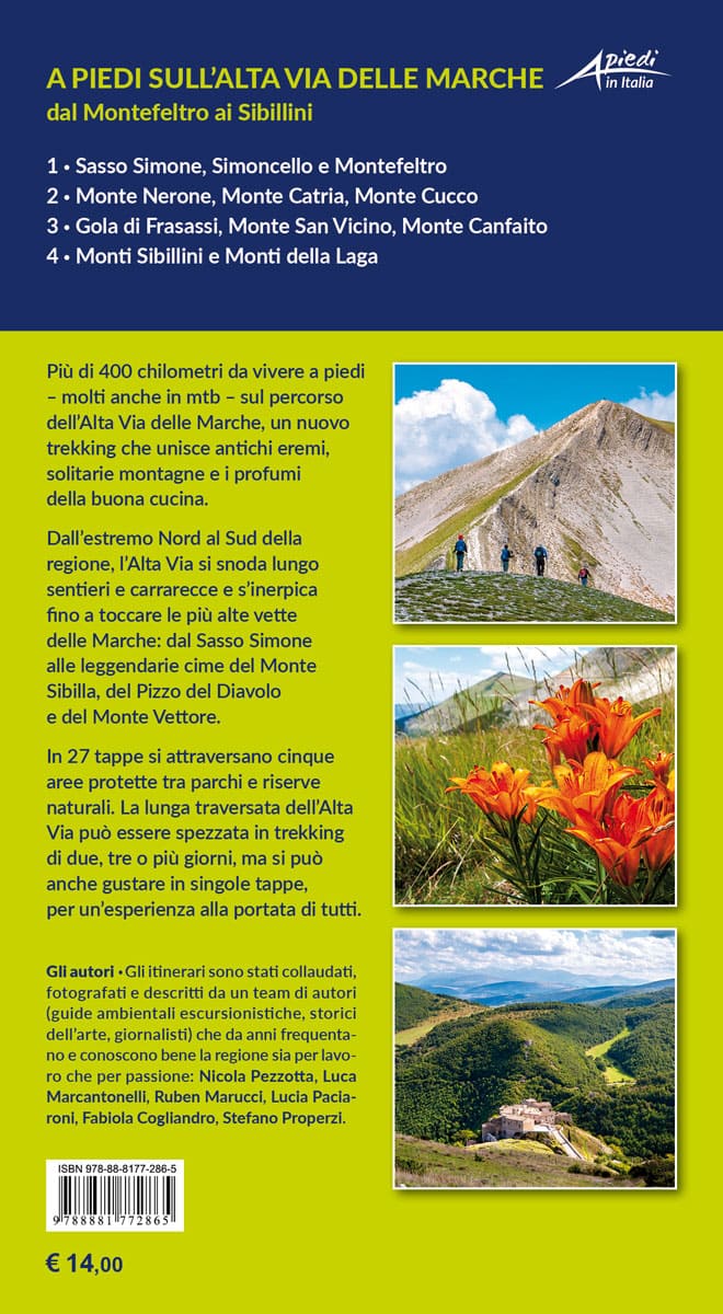 Gli itinerari della guida sono stati collaudati e descritti da un team di autori (guide ambientali escursionistiche, storici dell’arte, giornalisti) che da anni frequentano la regione: Nicola Pezzotta, Luca Marcantonelli, Ruben Marucci, Lucia Paciaroni, Fabiola Cogliandro, Stefano Properzi.